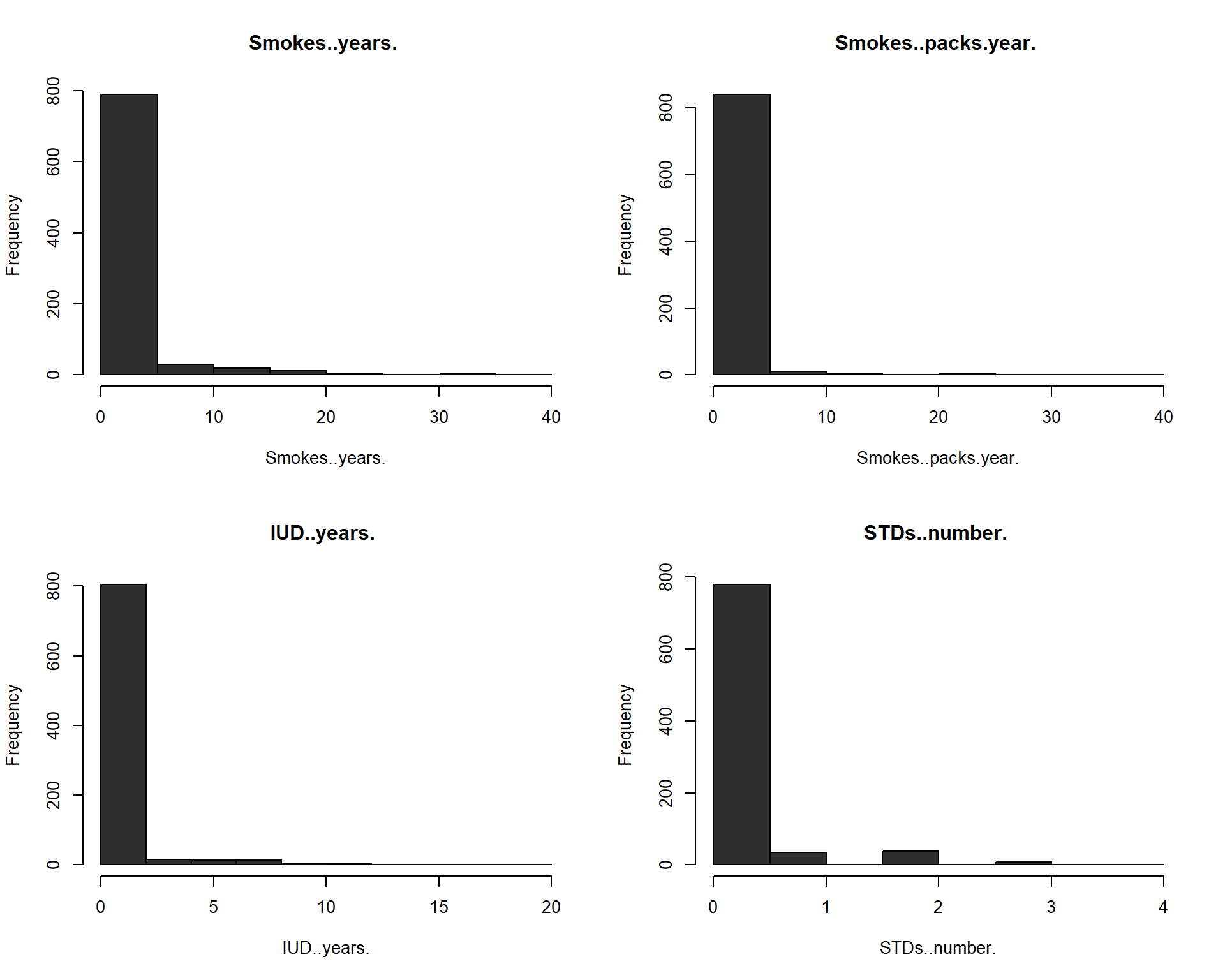 We begin this endeavor by selecting relevant libraries useful to our analytical approach and reading in (importing) the dataset as a flat .csv file into the RStudio environment. Observing the structure of the dataset is crucial in uncovering each variable’s behavior. To this end, all columns (variables) are converted to integers since our analysis will make predictions from numerical data. The dataset is further inspected for any missing values. 3,622 such values are uncovered, and subsequently imputed by the median value in each respective column. Our smoothing methodology relies on taking a “middle-ground” approach, thereby allowing for a representative sample. Attempting to impute the missing data using any other approach (i.e., K-Nearest Neighbors) yields negative values, and does not provide meaningful results. For example, smoking and pregnancies cannot and should not have negative values. Furthermore, the dataset is examined for near zero variance columns. Kuhn & Johnson (2016) assert that “some models can be crippled by predictors with degenerate distributions” (Kuhn & Johnson, 2016, p. 44). Whereas some variables (i.e., smoking) might be intrinsically linked to cancer detection visa vie inherent correlative relationships, we nonetheless omit them based upon this prescribed methodology. Figure 1 below shows four of the first such degenerate variable distributions.