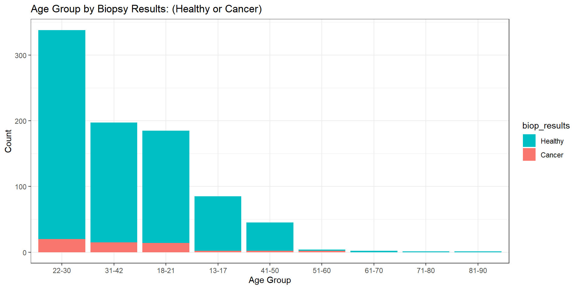 Note. Females of age group 22 to 30 not only capture the largest portion of the data (about 40%), but they also exhibit the highest prevalence of positive (cancer) biopsy test results.