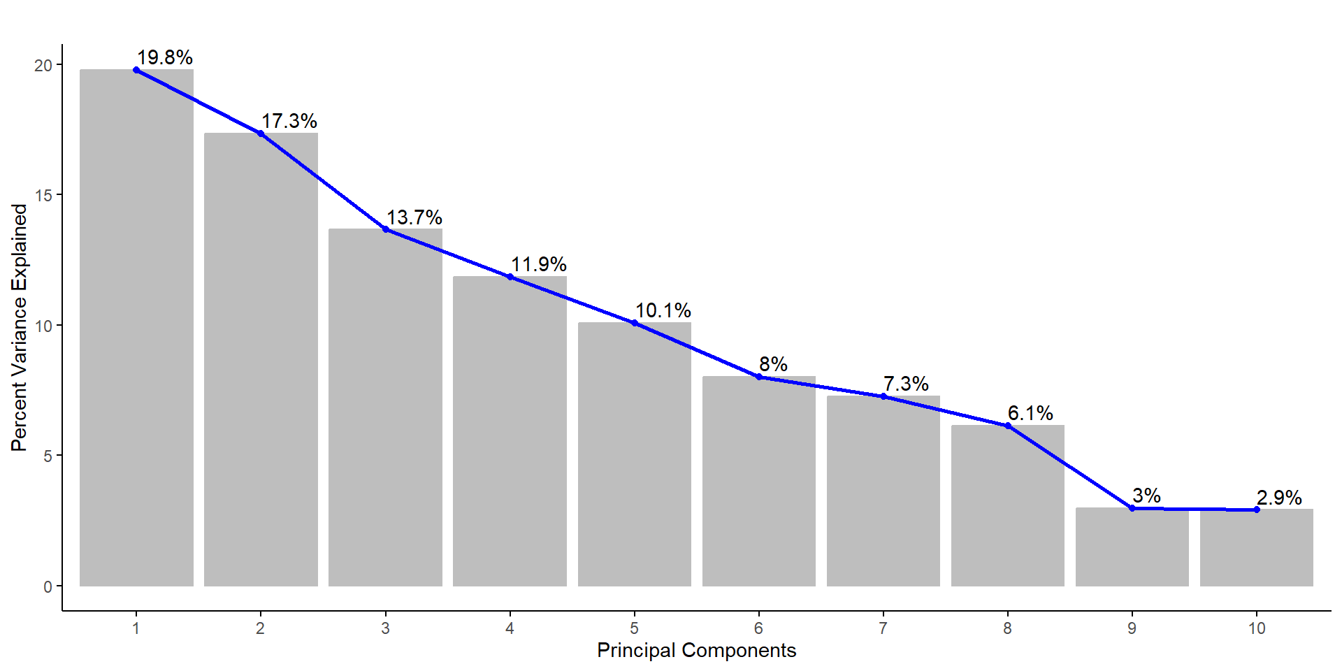 Approximately 19.8 % of the variance in the data is explained by the first principal component; thus, the effective dimension is one. This is supported by and demonstrated in the ensuing scree plot in Figure 3 which visually depicts “the percentage of the total variance explained by each component” (Kuhn & Johnson, 2016, p. 38). Moreover, herein, a pattern of numerical descent is detected – with each ensuing principal component capturing a progressively lower percentage of variability in the data. Similarly, the delta in each percent variance becomes progressively reduced, until there is almost no difference between the percent variance in eachprincipal component.