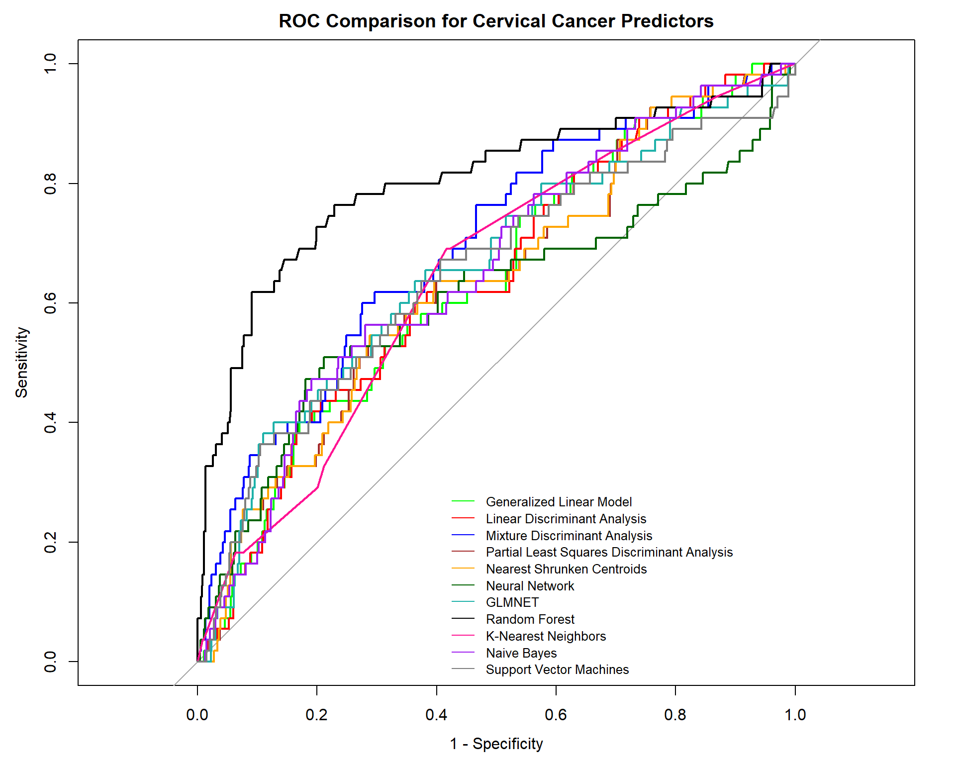 A thorough protocol for cervical cancer detection hinges on cytological tests in conjunction with other methodologies; we narrow our focus to patients that are healthy vs. unhealthy (those with positive biopsy results). Our predictive modeling endeavor stems from the selection of 858 female patients ages 13-84 from a Venezuelan inpatient clinic. The data is preprocessed, subjected to principal component analysis, and feature selection based on removal of highly correlated and near zero variance predictors. The data is subsequently partitioned using an 80:20 train-test split ratio to evaluate the model performance of data outside the training set. The class imbalance scenario whereby the majority of cases (healthy) is rebalanced with down sampling. We thereby propose eleven algorithms to aide in establishing the likelihood of being diagnosed with cervical cancer. Results vary based on key performance indicators of the receiver operating characteristics’ areas under their curves. Furthermore, each model is holistically evaluated based on its predictive ability. We focus on the highest true negative rate (specificity) to balance our selection with the highest performers.