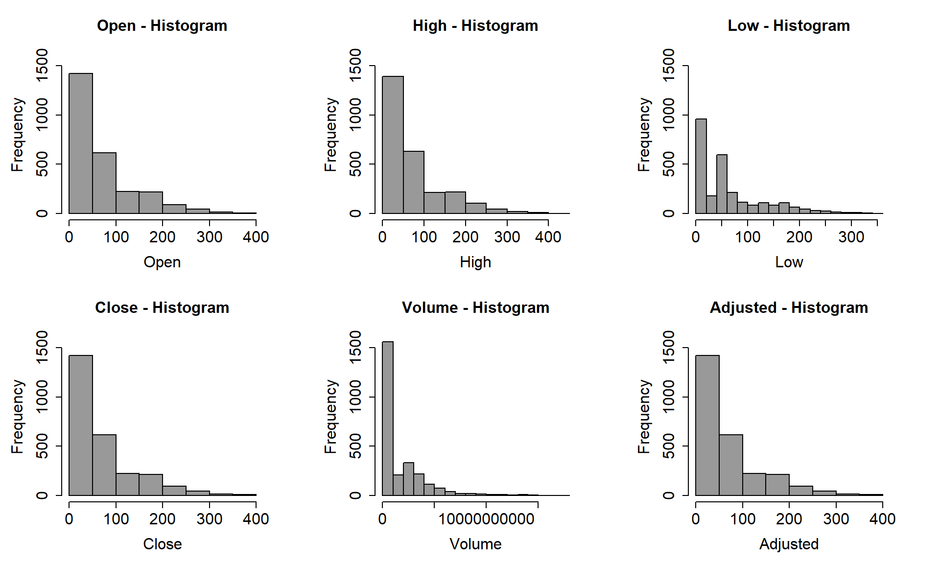 Data prior to September 17, 2014 is not available for reasons not offered by the provider. OHLC is used to abbreviate open, high, low, close prices in United States Dollars (USD). There are 24 missing values, which are omitted by calling a function that uses complete cases. Incomplete price data should not be imputed (i.e., mean, median, or any other method), for a potential loss in data integrity may result. This lends the dataset to subsequent preprocessing with relative ease. Examination of the OHLC price histograms and boxplots, respectively, reveals non-normal distributions for all variables. Figure 1 uncovers these degenerate, long-tailed distributions.