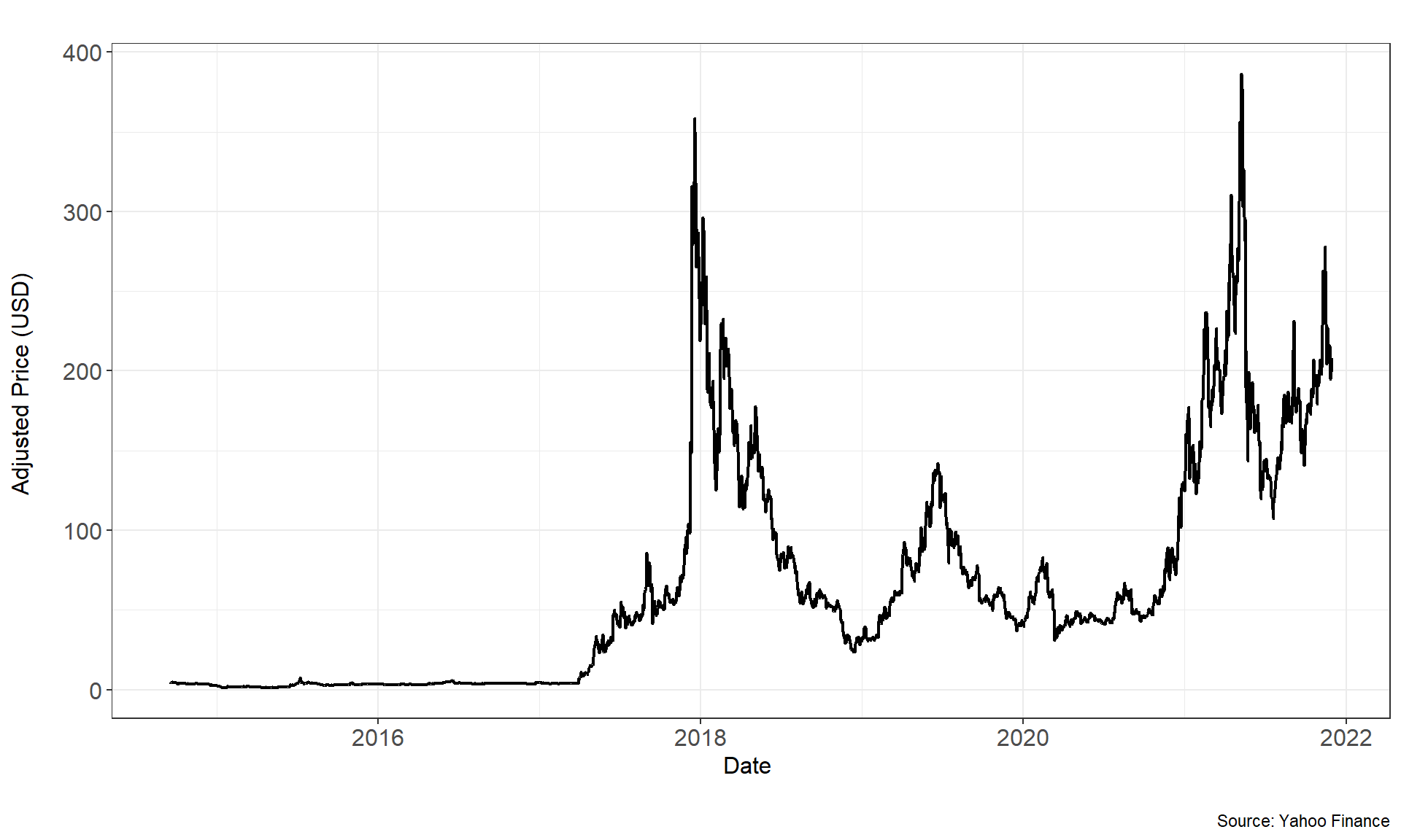 To graphically illustrate the historically adjusted prices, a new time series object in the form of a vector is created for the sole purpose of avoiding the representation of indexed time on the x-axis. Indexed time is harder to derive meaning from and defeats the purpose of graphical parsimoniousness. Therefore, it is important to see the impact of volatility visa vie market crashes and the corresponding years that this takes place. Furthermore, this object is placed into a plotting variable called litecoin_plot, with a starting date of 2014 and an annual frequency of 365; this is shown in Figure 2 below.