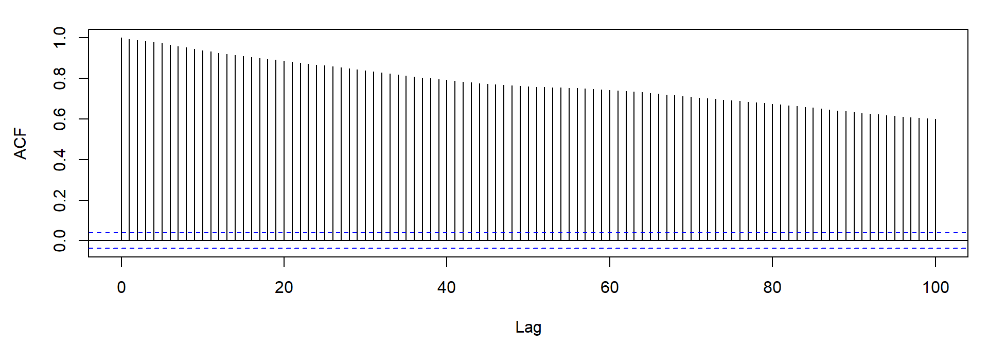 Note. A lag of 100 is enough to show these effects but is by no means the maximum lag for the series. Shumway & Stoffer (2019) present a basic equation for the expression of a long memory process as a byproduct of differencing fractional values where