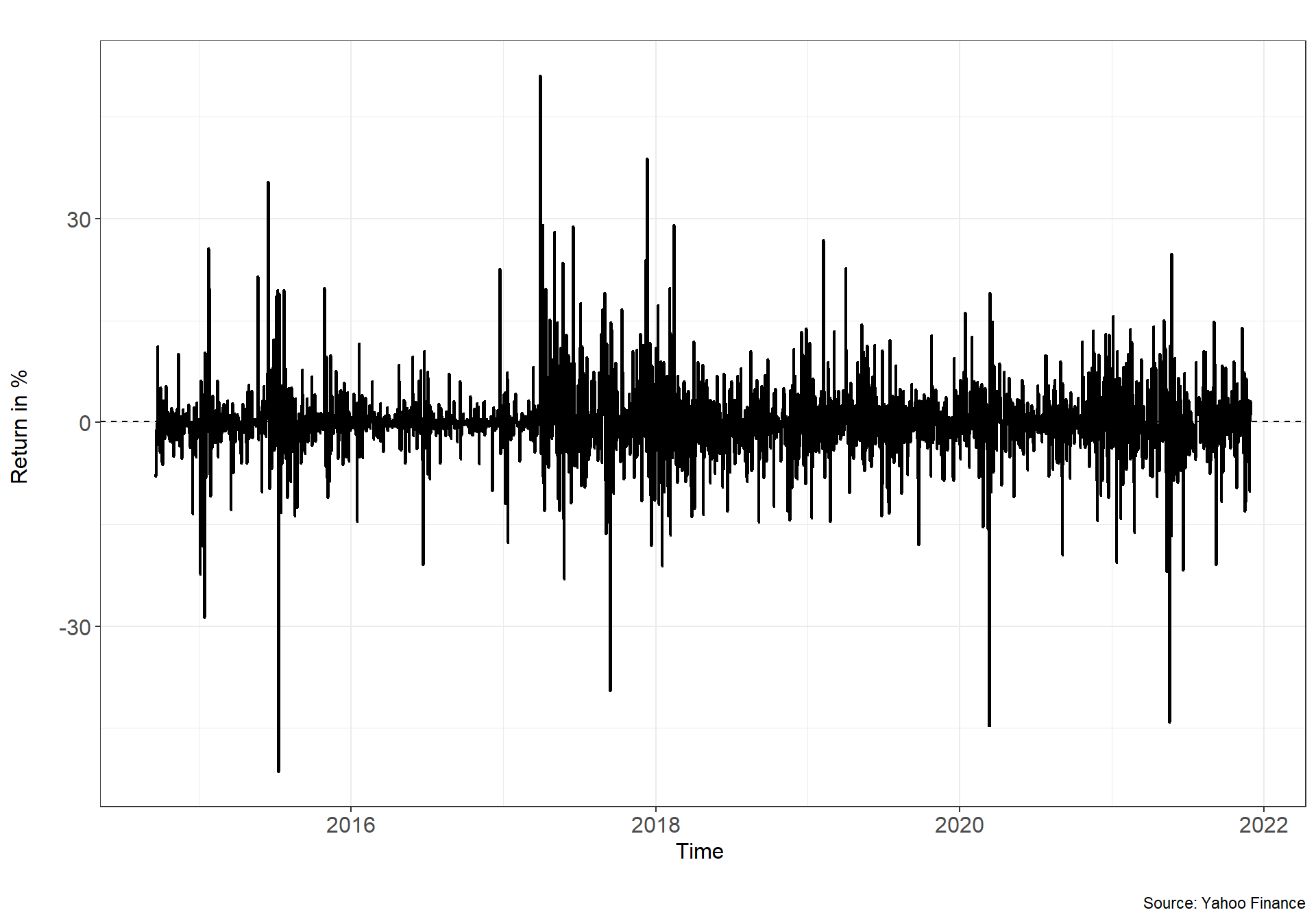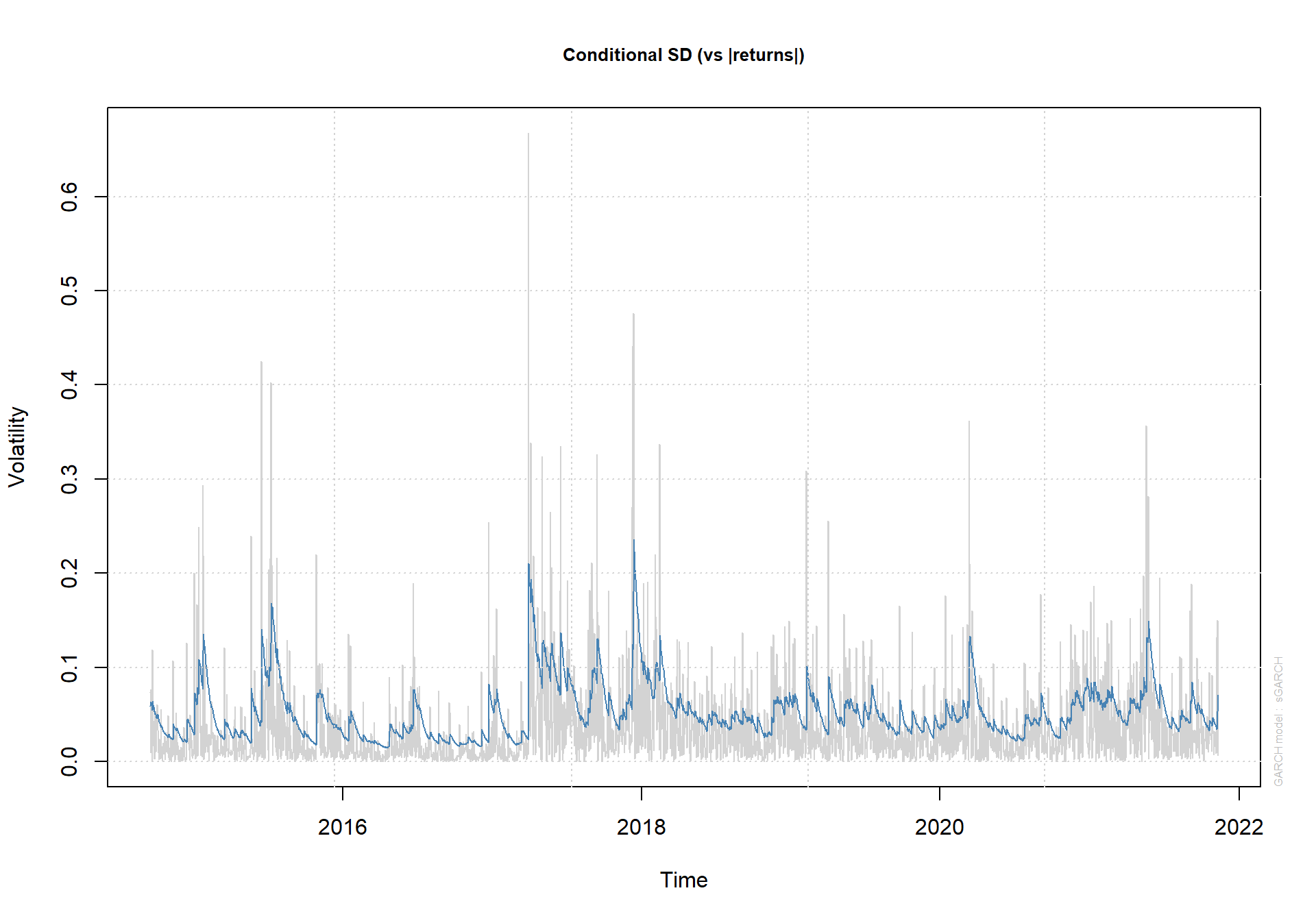 Fitting the GARCH(1,1) model to Litecoin’s return data uncovers some interesting findings. For example, whereas the presence of stochastic volatility has been established through the lens of annualized returns, its persistence is highlighted visa vie Figure 7 where the conditional standard deviation is plotted versus returns. Two prominent shocks are observed in early 2018 and 2020.