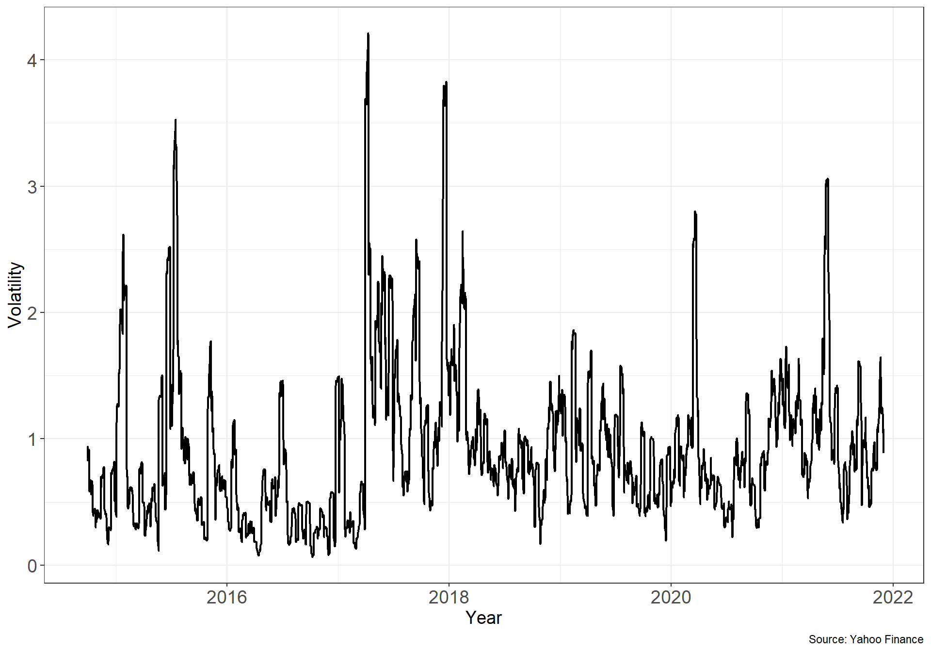 Note. The volatility trajectory is annualized through the end of 2021, expressing a standard deviation on return of approximately 0.058.