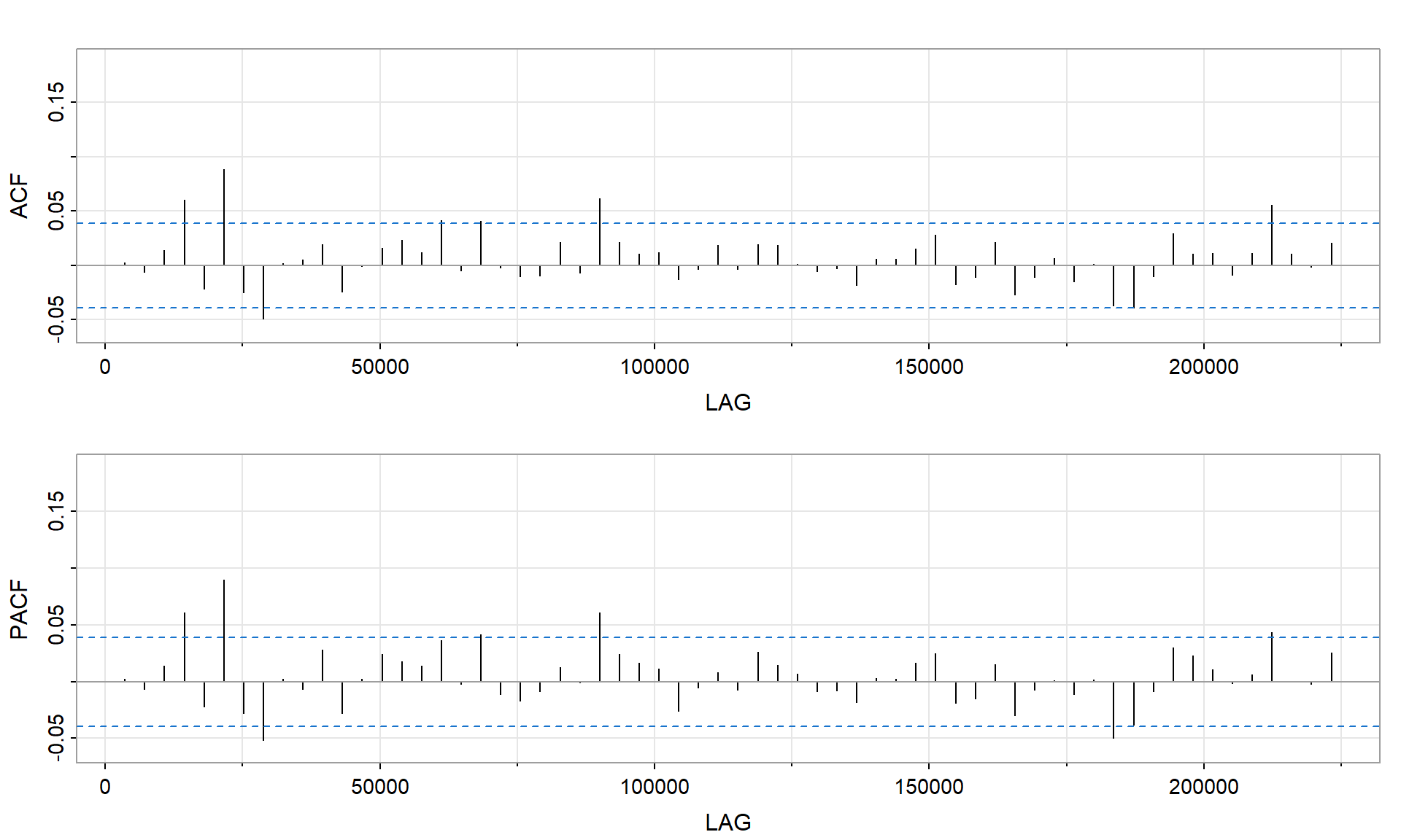Note. The ACF and PACF is shown at a maximum lag of 500 to highlight the gradual tailing off effect. However, the code corresponding to these plots in the Appendix is not set to a maximum lag, as it “defaults to \(\sqrt{n}\) + 10 unless \(n\) < 60” (Stoffer & Poison, 2021).