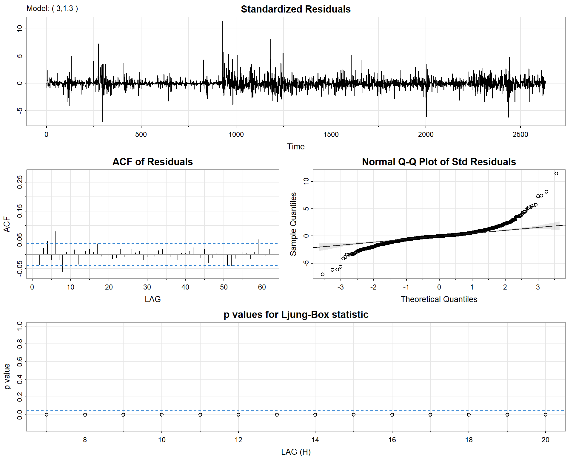 Figure 8 shows the ensuing graphical output for this model which contains the diagnostics for the standardized residual, ACF, Q-Q and Ljung-Box statistic.