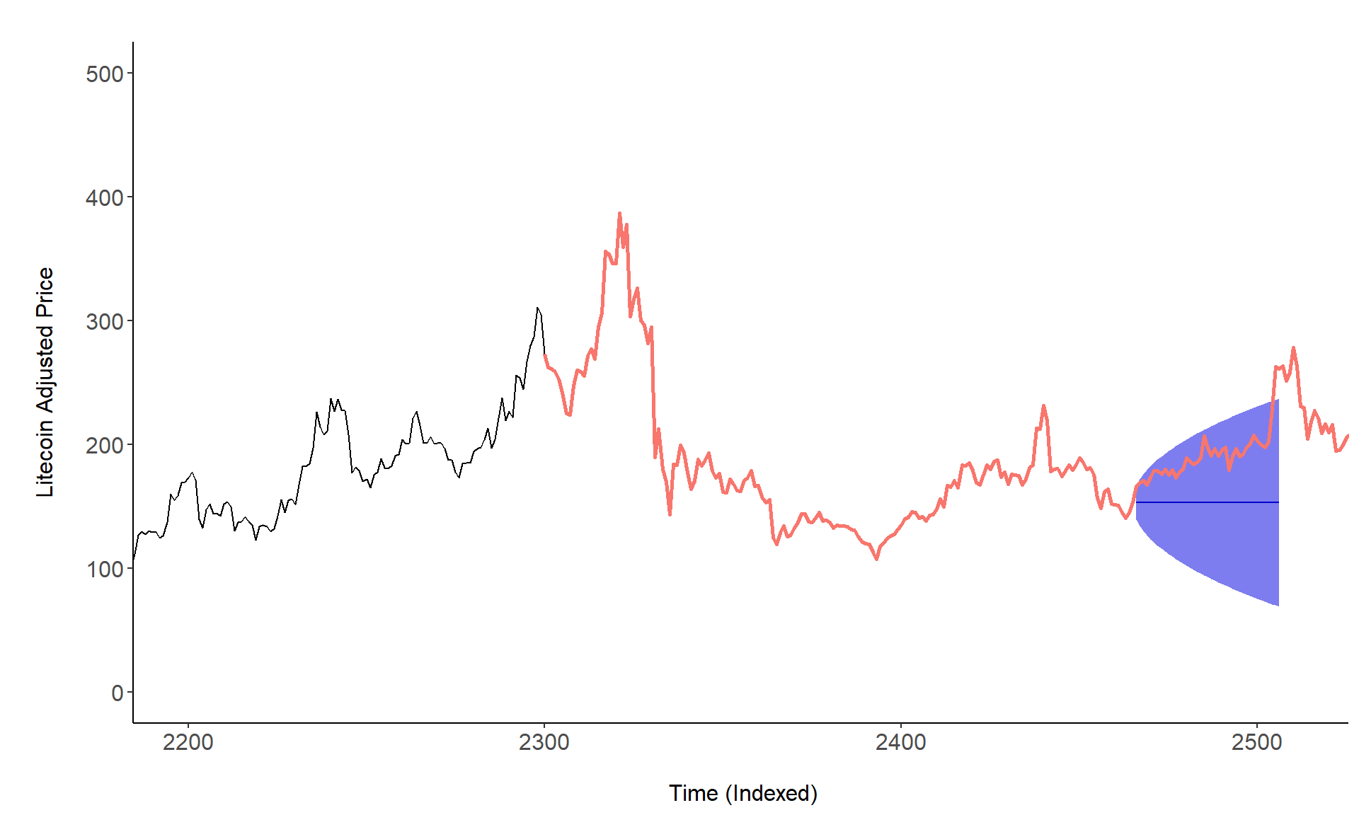 Note. Forecast prediction: Once Litecoin surpasses an adjusted closing price of $400, it will drop below $200 and continue to fluctuate normally (as expected), reaching a maximum value of $253.00 within the next 41 days.