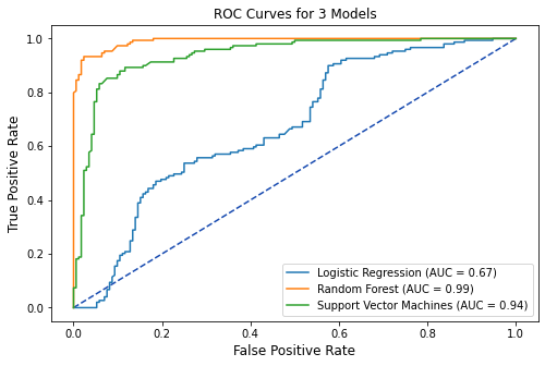 plt.title('ROC Curves for 3 Models',fontsize=12)