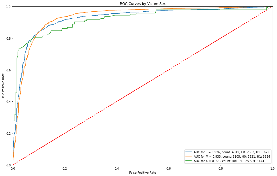 plot_roc_preds(df_preds_roc, 'ROC Curves by Victim Sex', 'Victim Sex')