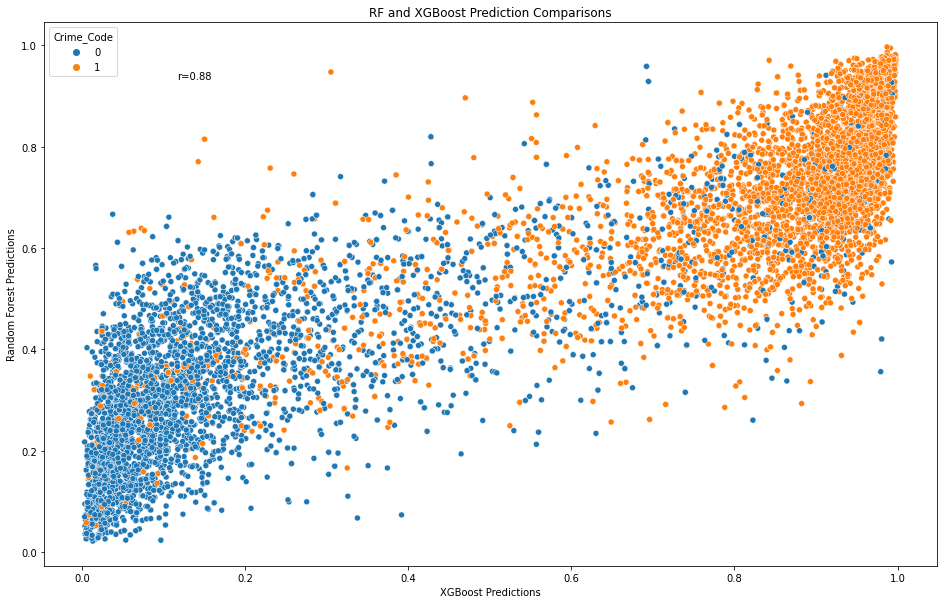 Note. Both models predictions are comparable at a Pearson correlation coefficient of r=0.84. Blue represents less serious crimes and orange represents more serious crimes.