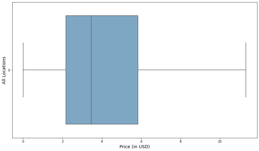 Exploratory data analysis will shed some light on these datasets, providing valuable metrics not limited to summary statistics and distribution. Figure 1 shows the distribution of sales prices across all territories. Whereas, the presence of outliers does not affect the median price, it does somewhat skew the data, in this case showing the average sales price to be $4.41. For this reason, we are interested in data that is resistant to outliers, since its large scale and size has a propensity to distort our findings from the ensuing analysis. Therefore, examining the distribution of sell_prices.csv, without outliers reveals the following boxplot: