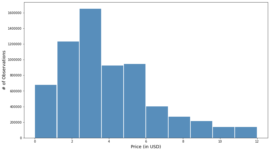 Note. The histogram confirms and exhibit a positive skewness, typically seen in a Poisson distribution, rather than a normal one. Moreover, there are over sixteen million observations between the $2 and $4 price points, leaning in favor of an optimal price within that range.