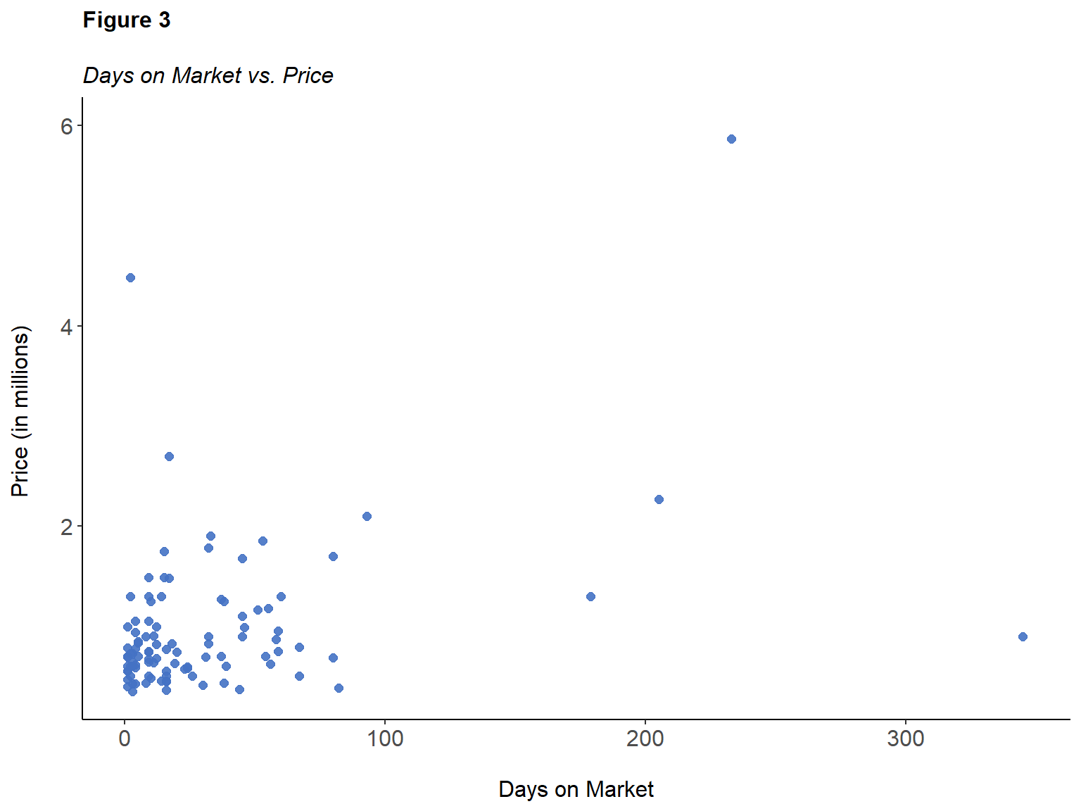 Conversely, Figure 3 illustrates that the relationship between days on the market and price is stronger, suggesting that a stronger linear relationship and positive correlation exist. As the number of days that a property stays on the market increases, a similar increase is witnessed in price. Days on market (or DOM as abbreviated by realtors) is “the number of days from the date on which the property is listed for sale on the local brokers’ multiple-listing services (MLS) to the date when the seller has signed a contract for the sale of the property” (Geffner, 2017). Moreover, this scatterplot illustrates that most of the properties in this sample remain listed for up to 100 days. Four properties stayed on the market from 179 – 345 days. These are the outliers. Though a positive correlation exists, there are several different factors that can affect the number of days that a property remains on the multiple-listing services (MLS), directly impacting sales price. For example, “when buyers notice your home’s above-average DOM, they’ll wonder what’s wrong. The question typically has three answers: price, condition, or location” (Geffner, 2017).